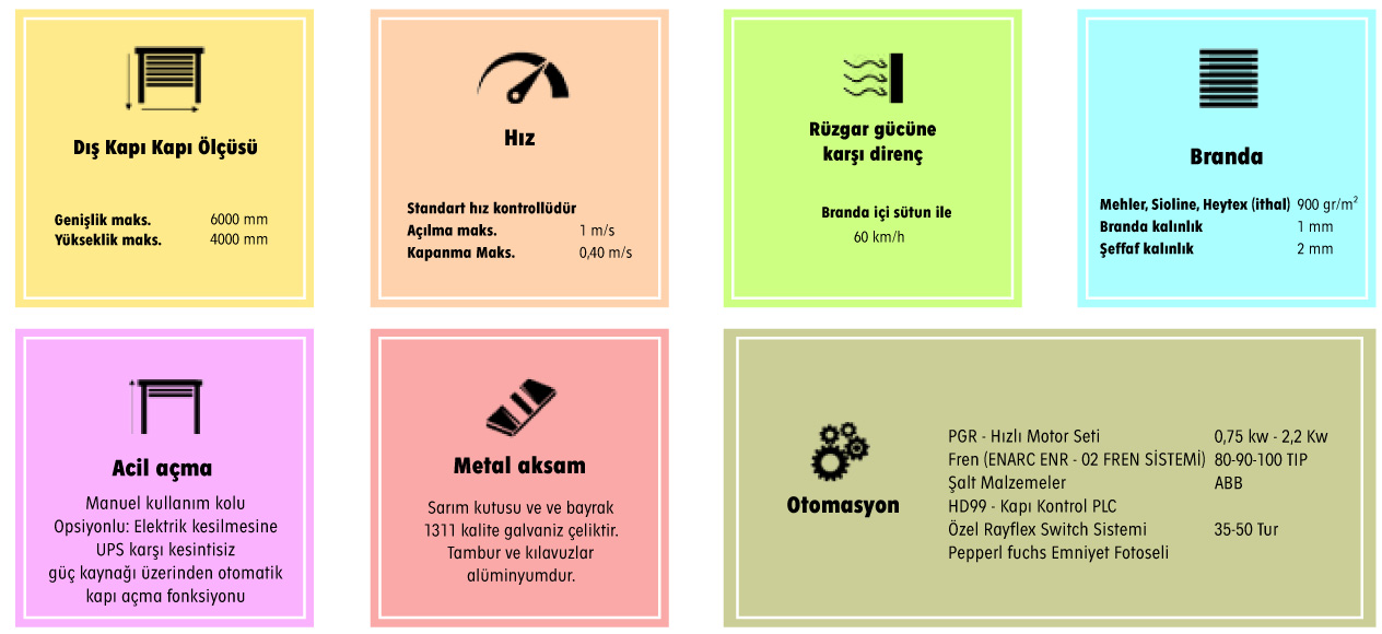 Alüminyum kılavuzlu ve alüminyum alt bazalıdır. Standartta gözetleme penceresi bulunmamakta olup, tercih edilirse eklenebilmektedir. Fakat her cam eklendiğinde branda içerisindeki lamel malzemesi eksildiği için kapının dayanım özelliği azalacaktır, bu sebeple pencere önerilmemektedir.